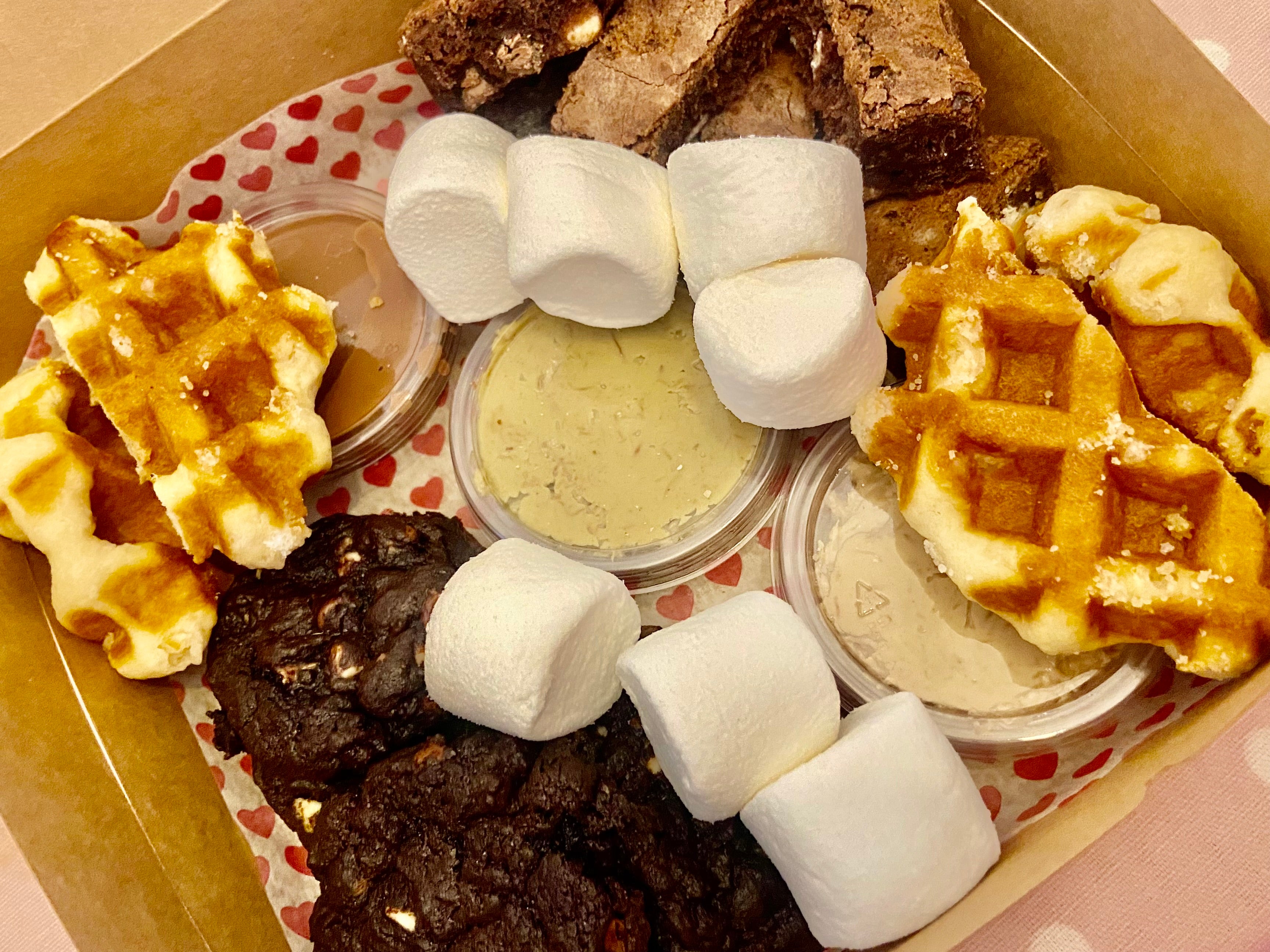 Our new dipping box is a perfect gift or treat, and is filled with triple chocolate brownies, chocolate chip cookies, Belgian sugar waffles, pistachio and white chocolate and hazelnut kunafa, Belgian milk chocolate and fluffy mallows.