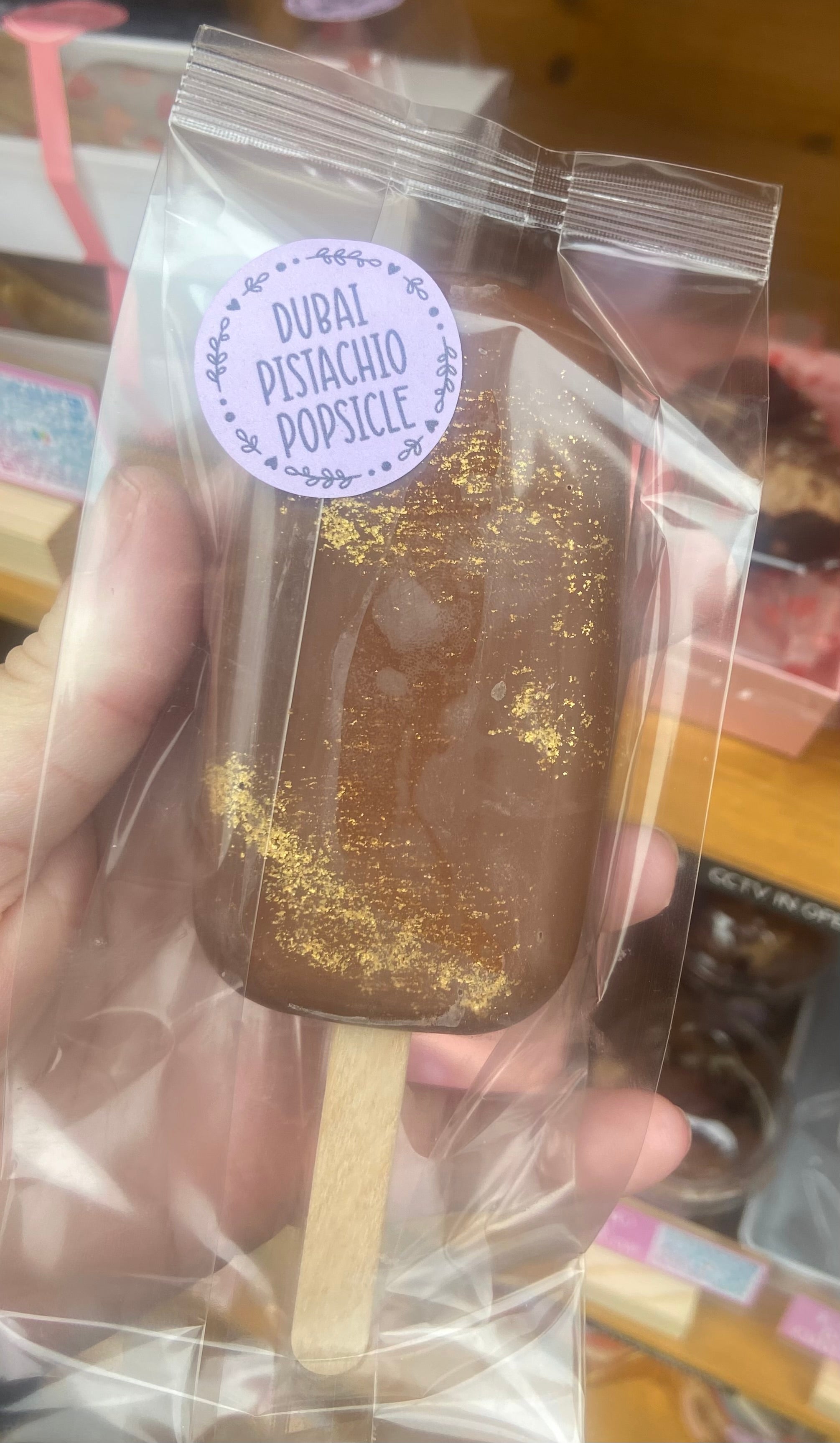 Our bestselling bars on a stick, these Dubai popsicles are filled with pistachio kunafa and coated with Belgian milk chocolate sprinkled with pistachio pieces.