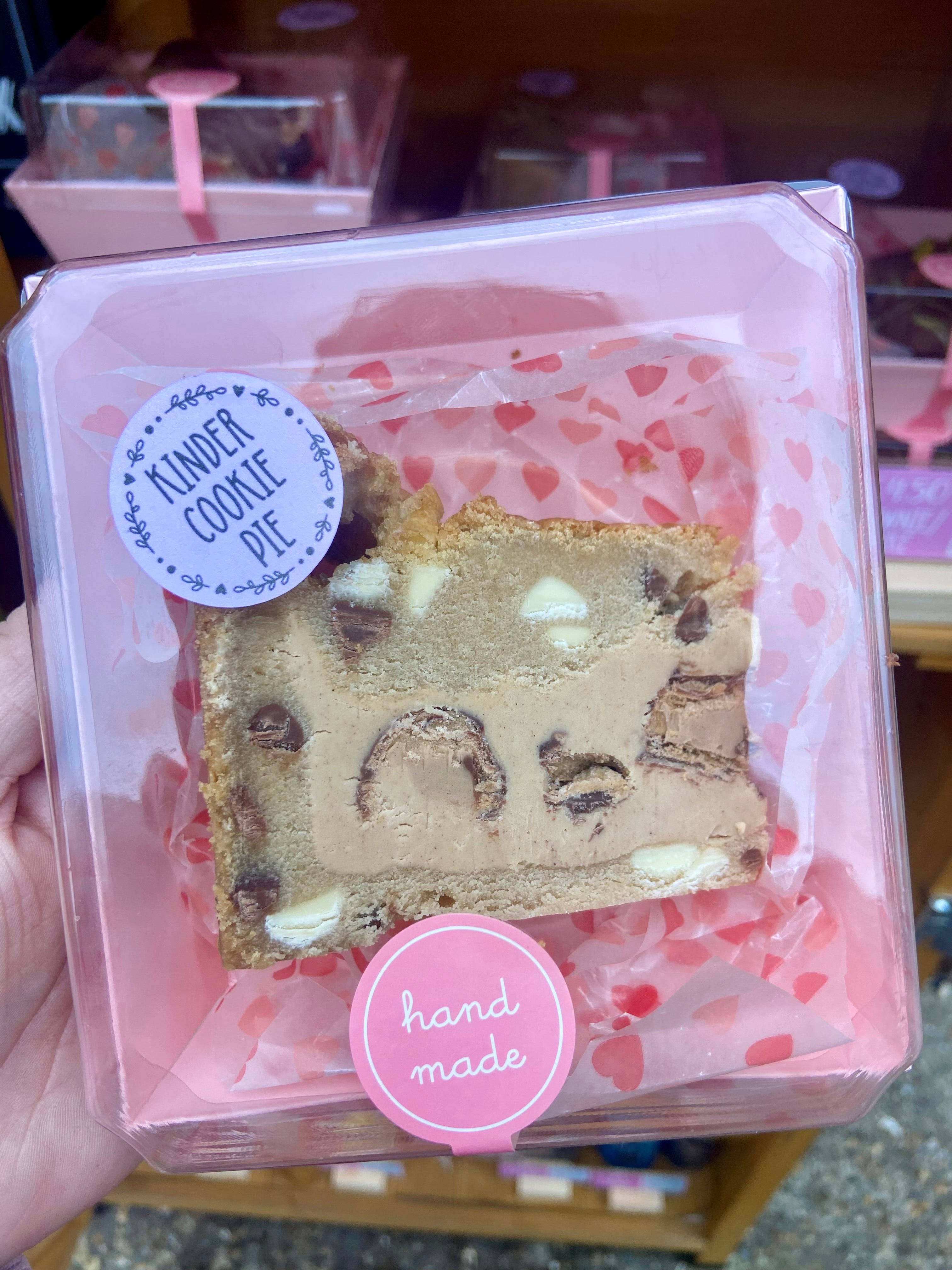 A slice of Kinder Bueno cookie pie featuring a cookie dough crust, hazelnut and white chocolate crème filling with Kinder Bueno chunks throughout.